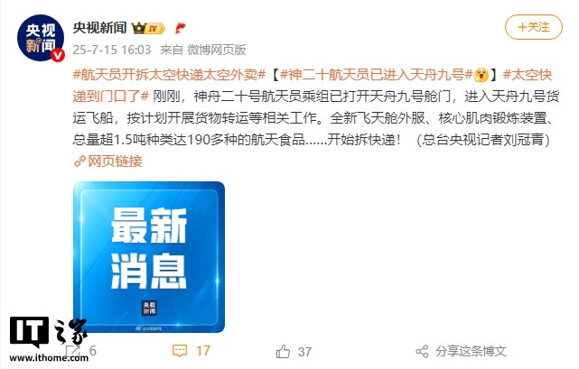 IT之家7月15日消息,据央视新闻报道,神舟二十号航天员乘组已打开天舟九号舱门,进入天舟九号货运飞船,按计划开展货物转运等相关工作。